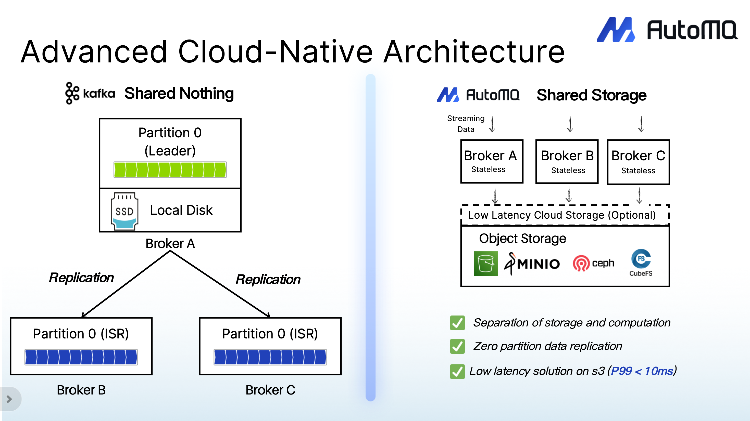 Because cloud storage already provides durability and redundancy, AutoMQ removes the overhead of Kafka’s multi-replica ISR mechanism, reducing both infrastructure cost and operational complexity.