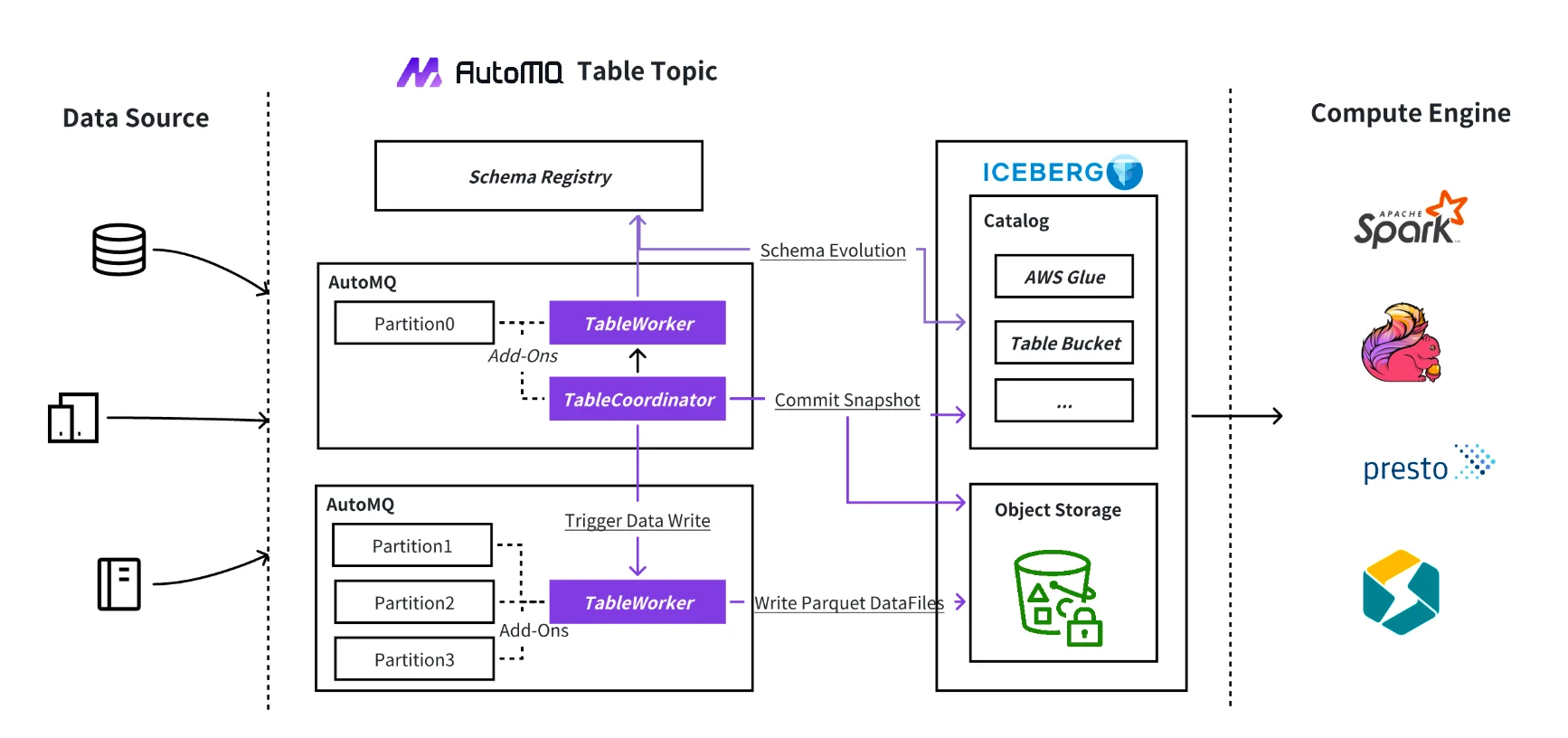 Introduced in AutoMQ 1.5.0 , Table Topic is a native binding mechanism that connects Kafka Topics directly to Apache Iceberg tables. Unlike conventional solutions that depend on external jobs, Table Topic is built into AutoMQ itself. Thanks to AutoMQ’s stateless architecture, it can continuously write Kafka message streams into Iceberg tables in real time—no Flink, Spark, Connect, or middleware required. With just a single configuration, users can materialize streaming data as structured table records, complete with automatic schema registration, evolution, field type mapping, and support for upserts. Leveraging the high throughput of S3 and AutoMQ’s fine-grained scheduling, Table Topic achieves real-time ingestion at several GiB/s while continuously compacting small files to optimize query performance—delivering true zero-ETL from Kafka to your data lake.
