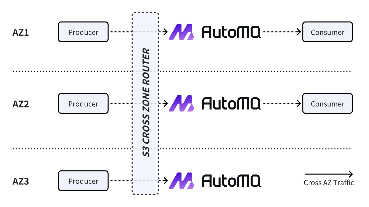Intercepting and Redirecting Production Traffic AutoMQ introduces an intelligent proxy layer at the Broker level that detects Produce requests originating from other AZs in real time. Instead of sending these requests directly across zones, the proxy uses S3 as an intermediary and establishes a cross-zone proxy channel to forward them to the appropriate partition Leader Broker. As a result, producers only need to communicate with Brokers within their local AZ, avoiding any cross-zone traffic.