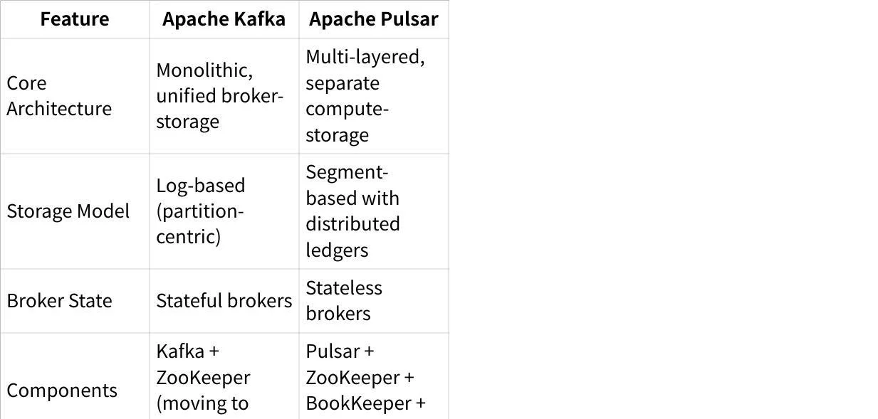 Kafka has a medium-weight architecture consisting of ZooKeeper and Kafka brokers (though Kafka is moving to KRaft). Pulsar has a heavier architecture requiring management of four components: Pulsar brokers, BookKeeper, ZooKeeper, and RocksDB.