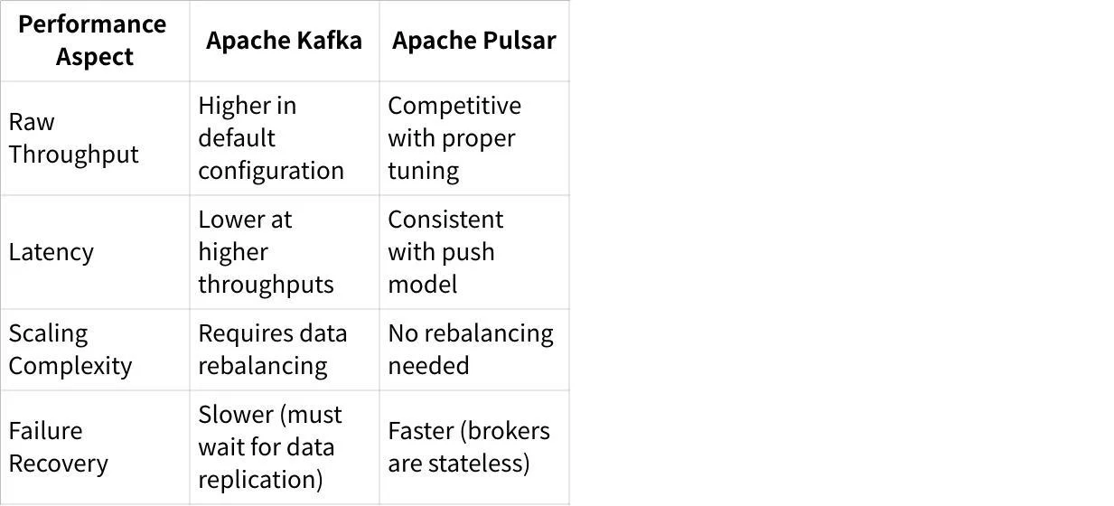 According to benchmarks, Kafka provides higher throughput in some scenarios, writing up to 2x faster than Pulsar in certain tests. However, performance heavily depends on configuration, hardware, and specific workloads. Pulsar's segment-oriented architecture can achieve excellent throughput when properly tuned.