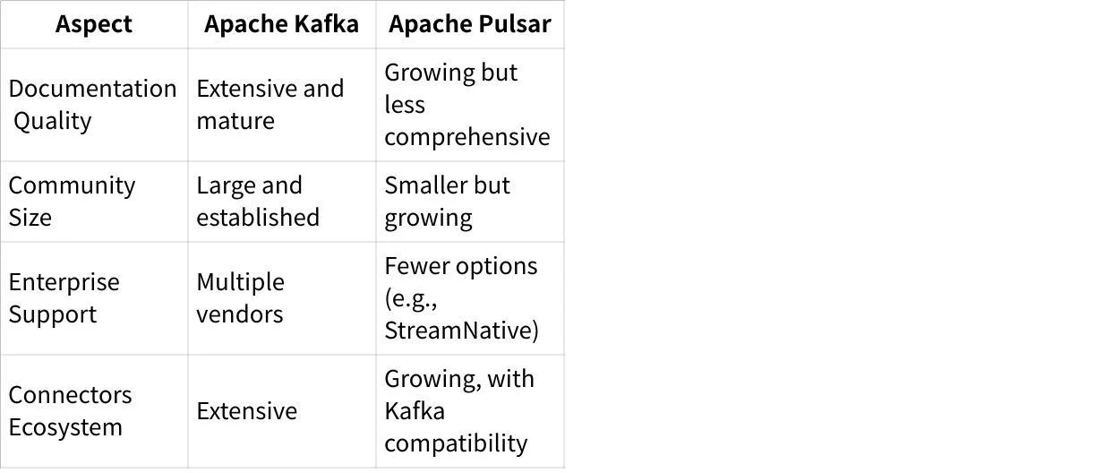 Kafka has extensive documentation (over half a million words), numerous books, tutorials, and active community forums. Pulsar's documentation is less comprehensive, with users reporting issues with outdated information.