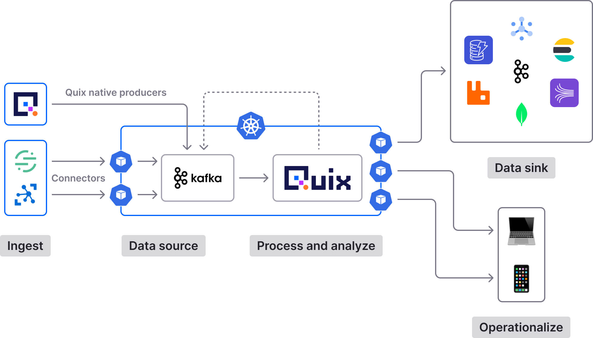 In a typical implementation, Quix works as a complementary layer on top of Kafka: