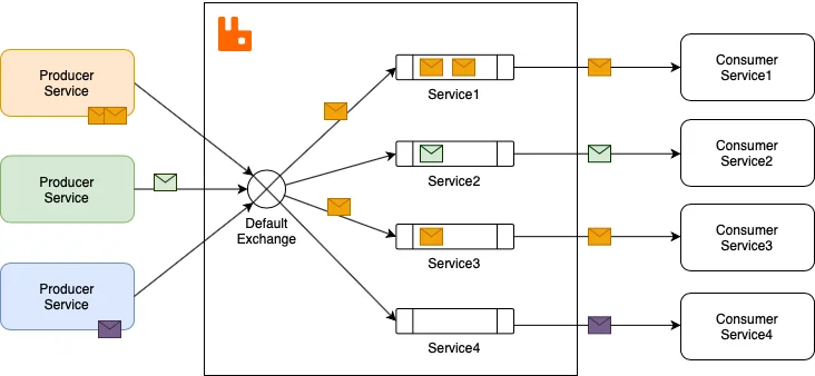 RabbitMQ uses an exchange-based architecture where: