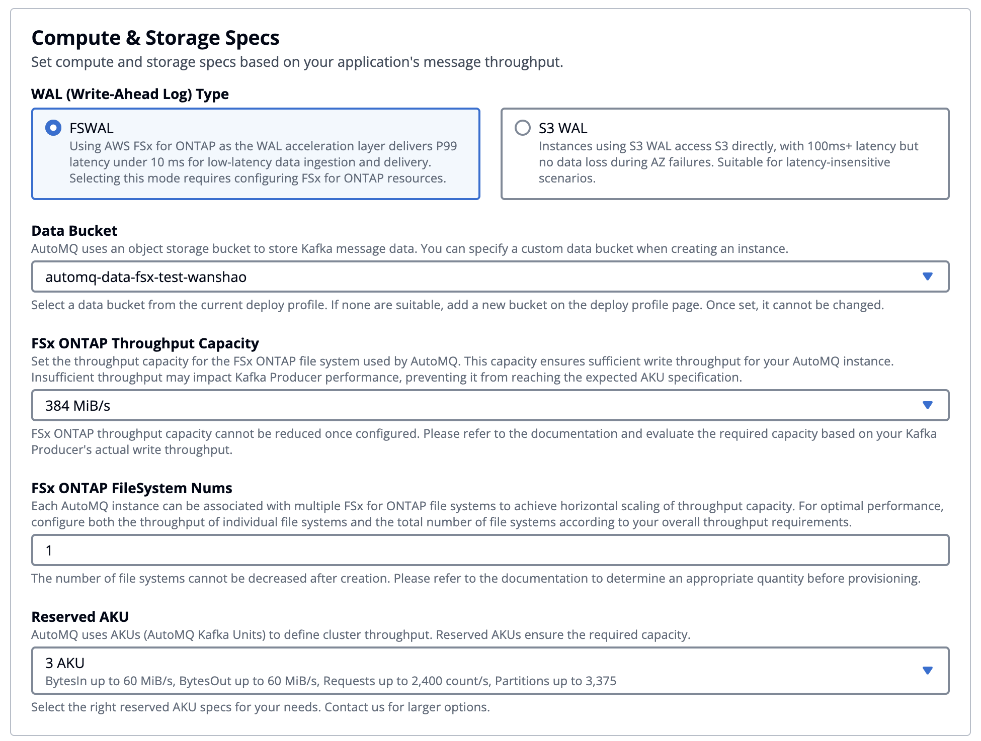 In this example, we choose FSx WAL. In addition to configuring the AKU, you also need to select the instance specifications and quantity for Amazon FSx for NetApp ONTAP. AutoMQ has systematically benchmarked and validated the performance of different FSx ONTAP instance specifications, so users don’t need to handle complex planning based on IOPS, bandwidth, capacity, and other dimensions on their own; they can quickly estimate the required number of FSx instances based on the target write throughput by referring to the table below. In the current configuration, we have chosen 3 AKU (which supports 60 MB/s of both read and write throughput), and only 1 FSx instance with a 384 MBps specification is needed to meet the WAL write performance requirement.