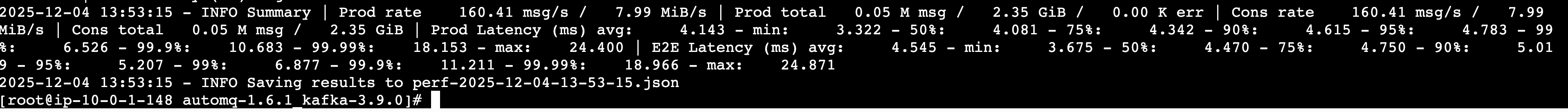 In this example, we use the perf tool wrapped by AutoMQ based on OpenMessaging[5], to perform performance testing. We initiated the following workload test from an EC2 instance within the same VPC.