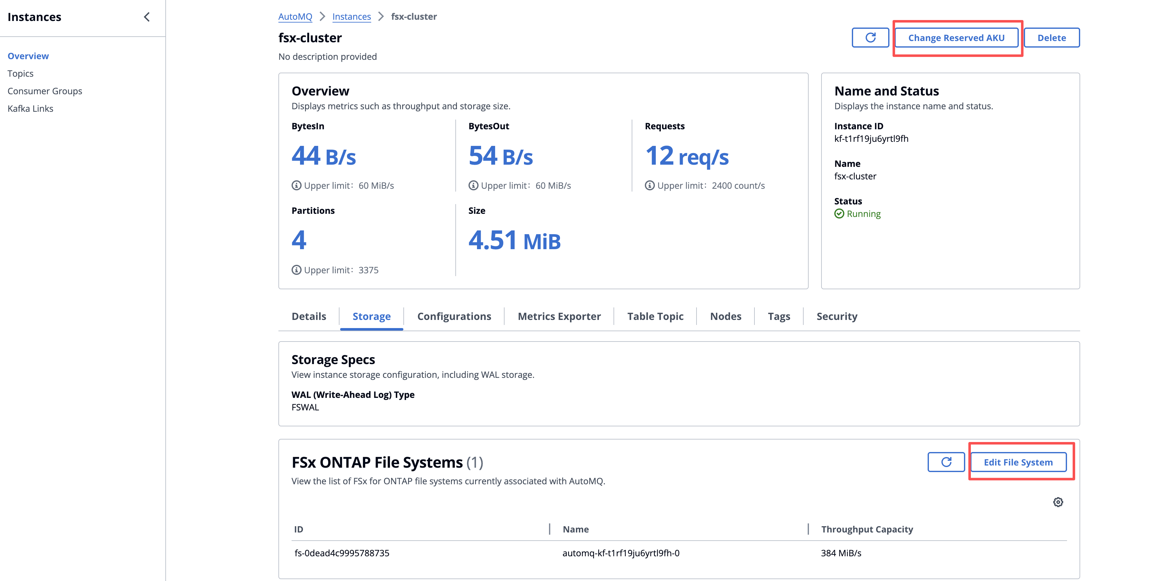 FSx: Thanks to AutoMQ’s decoupled storage and compute architecture, primary data is fully persisted in object storage, while FSx is only used to accelerate hot-path I/O such as WAL. You can scale horizontally by increasing or decreasing the number of FSx instances, without the heavy partition migrations and data movement typically associated with traditional Kafka, thus increasing or decreasing FSx capacity and bandwidth without impacting business operations.