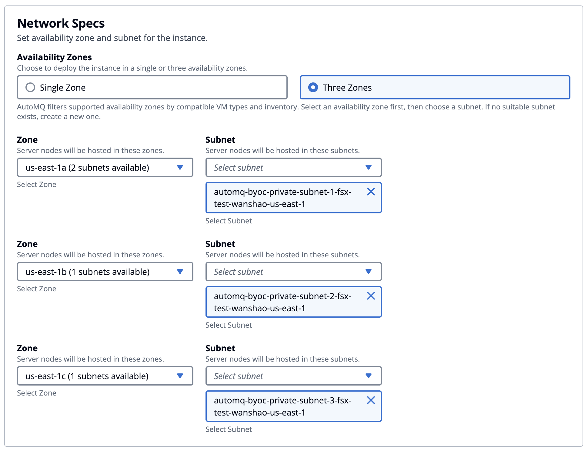 In the cluster creation step under the Network Specs section, choose the 3-AZ deployment. On AWS, if a single-AZ deployment is selected, we still recommend using EBS WAL first, as it offers the best performance and cost efficiency. For multi-AZ deployments, considering the cross-AZ network transfer costs, you can opt for S3 WAL or FSx WAL. For details on the cost and performance differences when choosing different WAL options in AutoMQ, please refer to the official documentation [3].