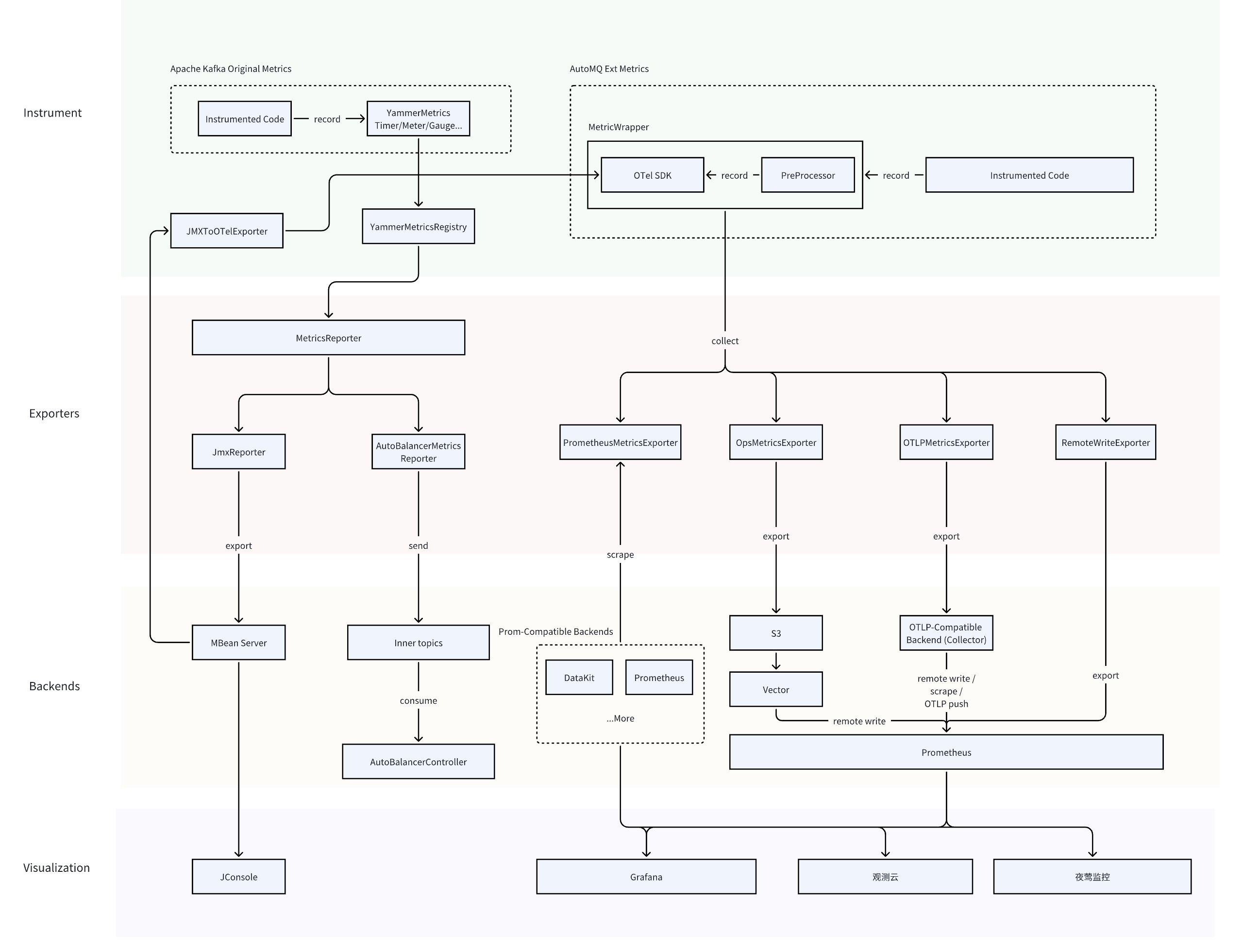 Apache Kafka's server-side primarily relies on YammerMetrics, a third-party library, to define and collect metrics. It exposes observation interfaces by registering metrics to the MBeans server, and during the actual integration process, third-party agents such as jmx_exporter are required to complete the integration with the observability backend. As a cloud-native reimagined stream processing platform, AutoMQ naturally requires more native observability methods. OpenTelemetry (OTel for short), as the de facto standard framework for cloud-native application observability, naturally becomes the first choice for AutoMQ. The overall observability architecture of AutoMQ is illustrated below. This section will introduce the architecture in four parts: collection, export, observability backend, and visualization frontend.