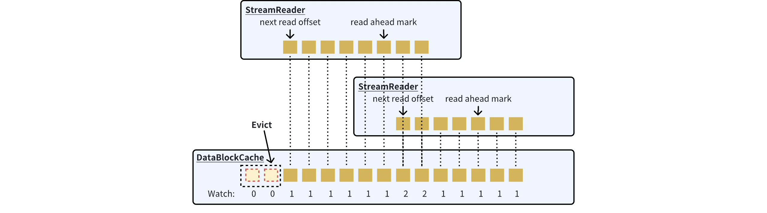 To address this issue, AutoMQ has introduced a watch-based eviction policy on top of LRU. Within the read window (StreamReader), DataBlocks that are being read or are about to be read are marked with a +1 watch count. Once the read window completes reading a DataBlock, the watch count for that DataBlock is decremented by 1. BlockCache will prioritize the watch-based eviction policy; when a DataBlock’s watch count drops to 0, it will be immediately evicted from the cache, even if there is still cache space available.