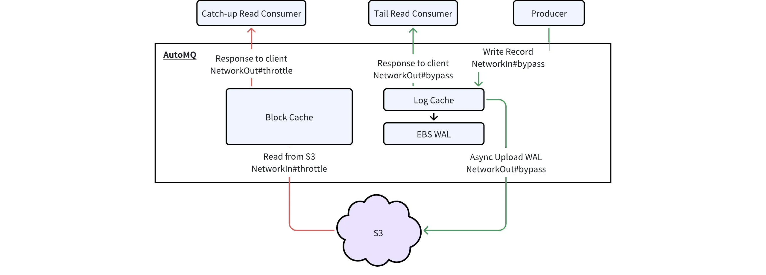 - Network Prioritization and Rate Limiting : AutoMQ can set overall network ingress and egress limits, with Producer traffic given higher priority than tailing read Consumer traffic. This ensures that tailing read traffic does not saturate the network bandwidth and impact sending operations.