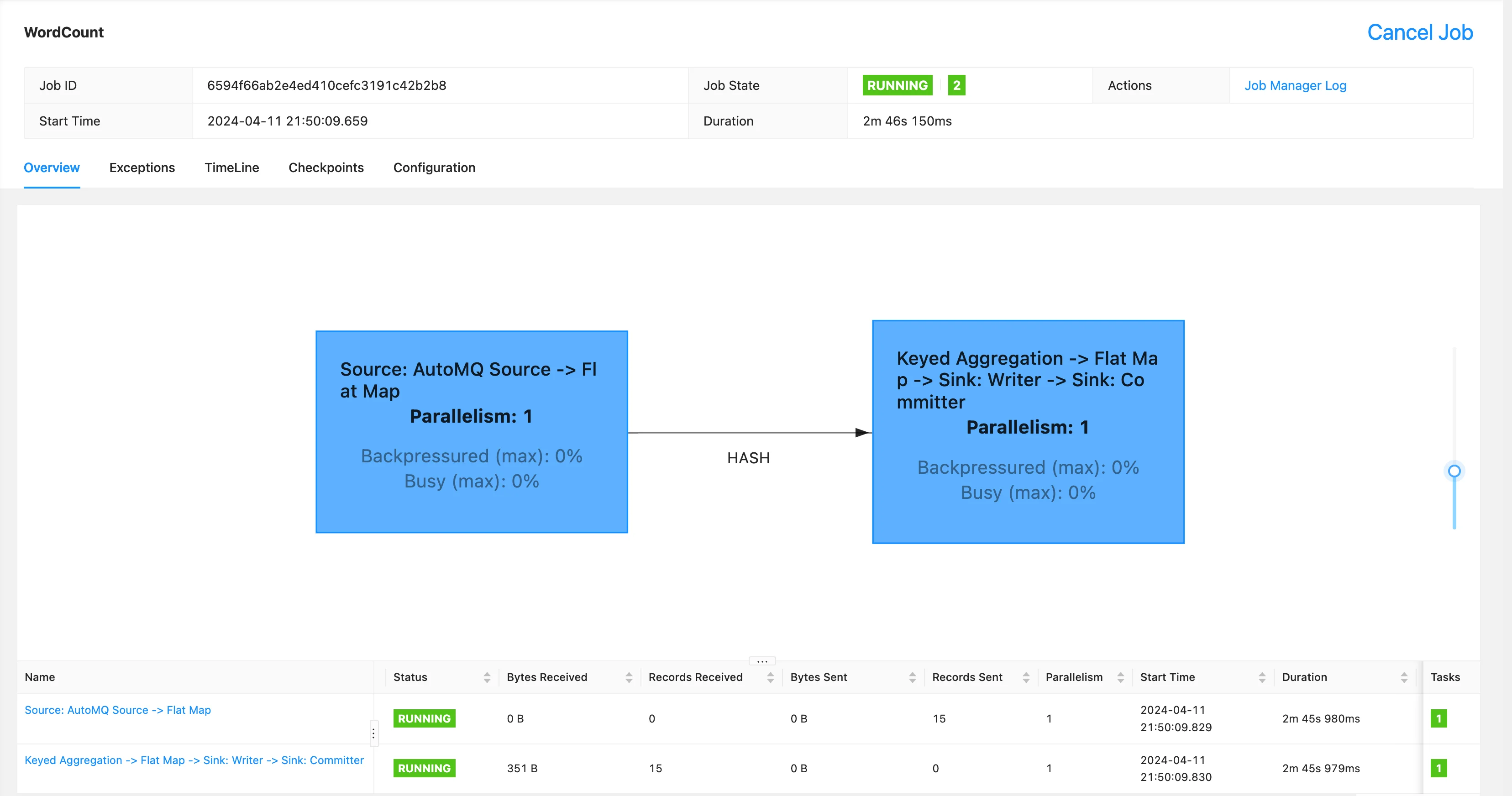 This article illustrates how AutoMQ seamlessly integrates with Flink to perform a Word Count analysis. For additional configuration and usage details on the Kafka Connector, please consult the Flink official documentation Apache Kafka Connector.