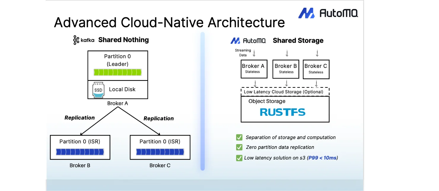 Extreme Cost Optimization : AutoMQ, with its compute-storage separation architecture, can save up to 90% on Kafka TCO and, through multi-point read/write architecture optimization, completely avoids expensive cross-Availability Zone (AZ) traffic. RustFS's lightweight architecture has low hardware requirements, and combined with the Apache 2.0 friendly license, further reduces storage and software licensing costs.