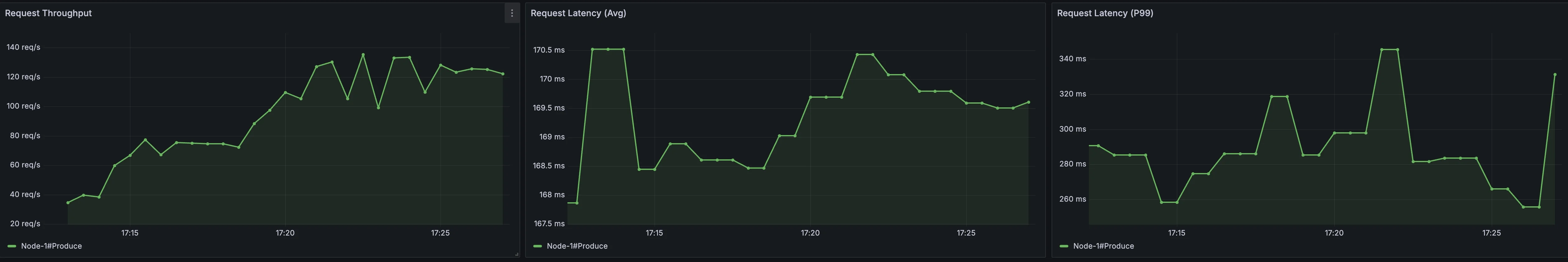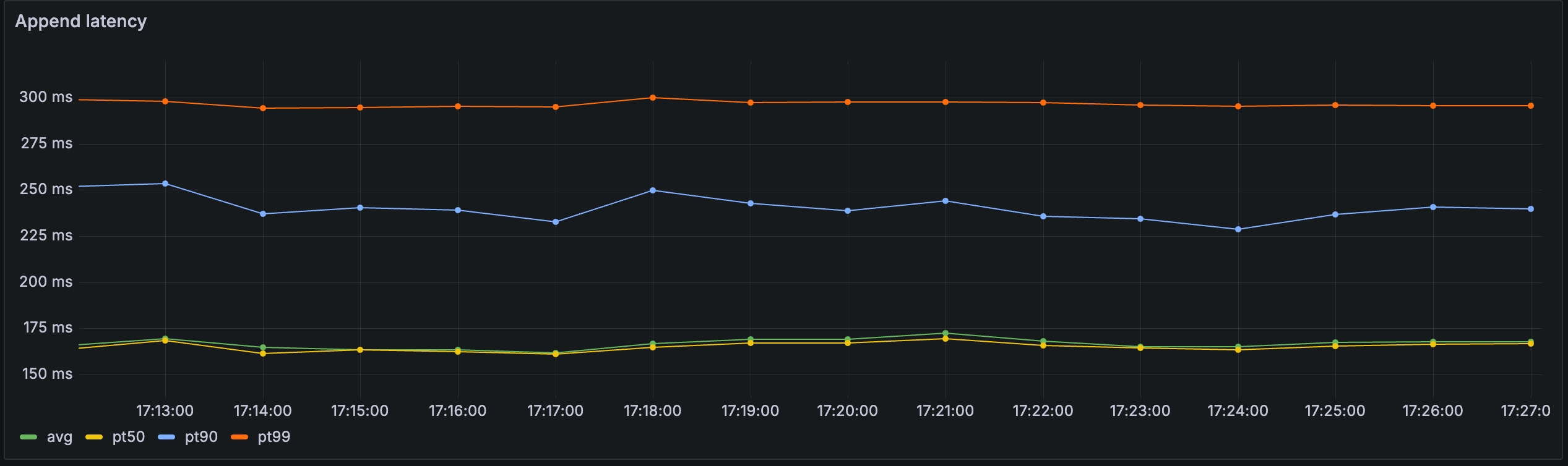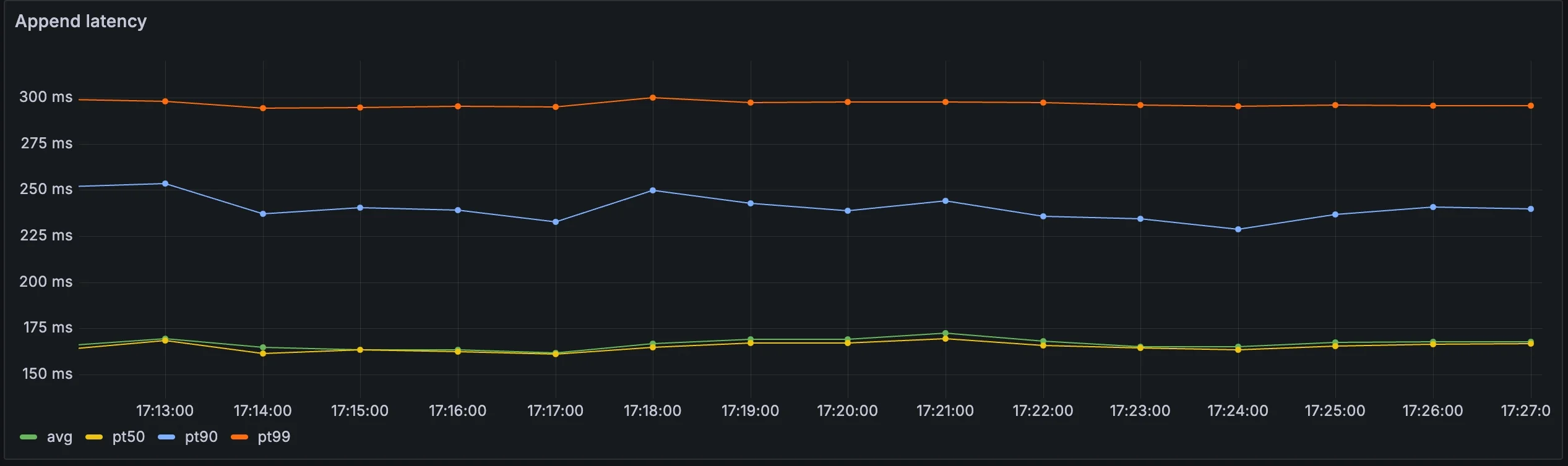 AutoMQ has made numerous optimizations to the performance of S3 WAL, particularly its latency performance. In our test scenarios, the average latency for S3 WAL Append is 168ms, with P99 at 296ms.