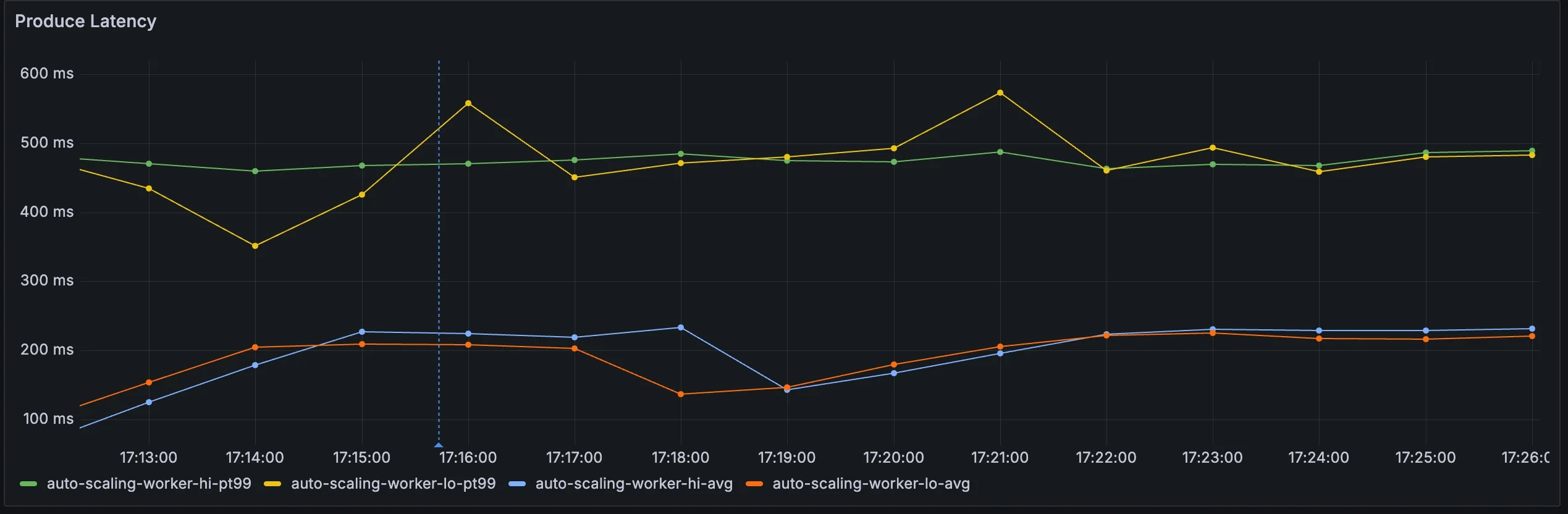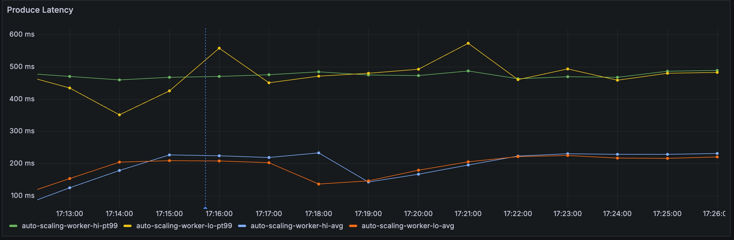 Kafka Produce request processing latency averages 170ms, with P99 at 346ms.