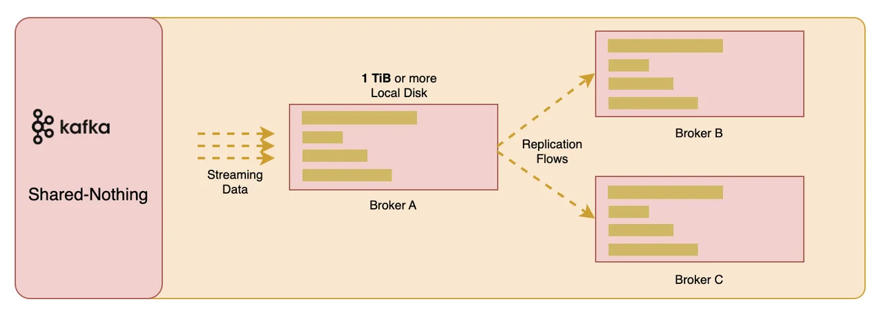 Over a decade ago, Kafka was born in an era where the IDC (Internet Data Center) was the main scenario. At that time, computing and storage resources were usually tightly coupled together, forming a shared-nothing architecture of integrated storage and computation. This architecture was very effective in the physical data center environment at that time, but with the maturity of public cloud technology, its limitations gradually became apparent. The shared-nothing architecture's storage and computation are strongly coupled, making it impossible to completely decouple the storage layer and offload capabilities such as durability and high availability of cloud storage services. This also means that shared-nothing architectures cannot take advantage of mature cloud storage services' elasticity and cost benefits. In addition, this integrated architecture makes Kafka lack elasticity and difficult to scale. When adjusting the capacity of a Kafka cluster, a large amount of data replication will be involved. This will affect the efficiency of its capacity adjustment, and it will also impact normal read and write requests during the adjustment period.