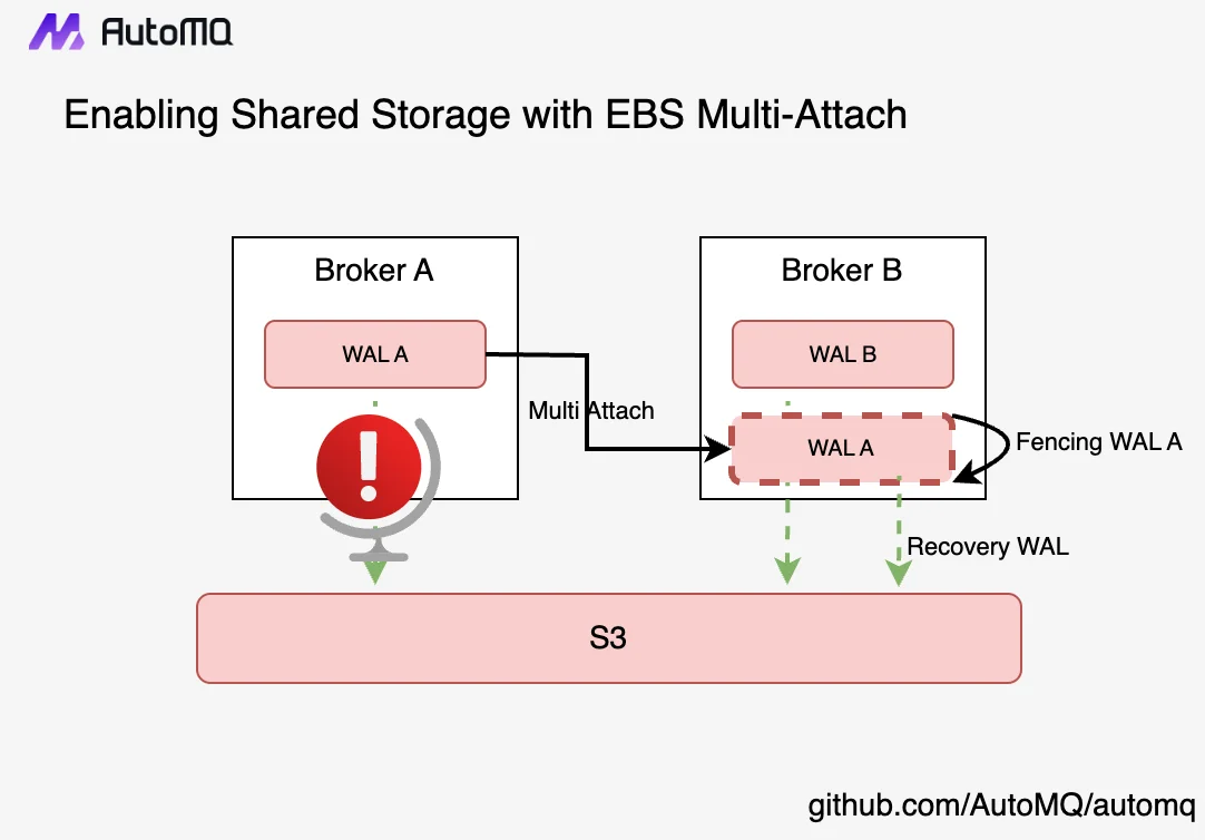 A common misconception is confusing the Shared WAL built on EBS with Kafka's tiered storage. The main way to distinguish them is by determining if the compute node Broker is completely stateless. For tiered storage implementations by Confluent and Aiven, their Brokers are still stateful. Kafka's tiered storage requires that the last log segment of its partitions be on a local disk, hence the data on local storage is tightly coupled with the compute layer's Broker. In contrast, AutoMQ's implementation of EBS WAL does not have this limitation. When a Broker node crashes, other healthy Broker nodes can take over the EBS volume within milliseconds using Multi Attach, write the small fixed-size (typically 500MB) WAL data to S3, and then delete the volume.
