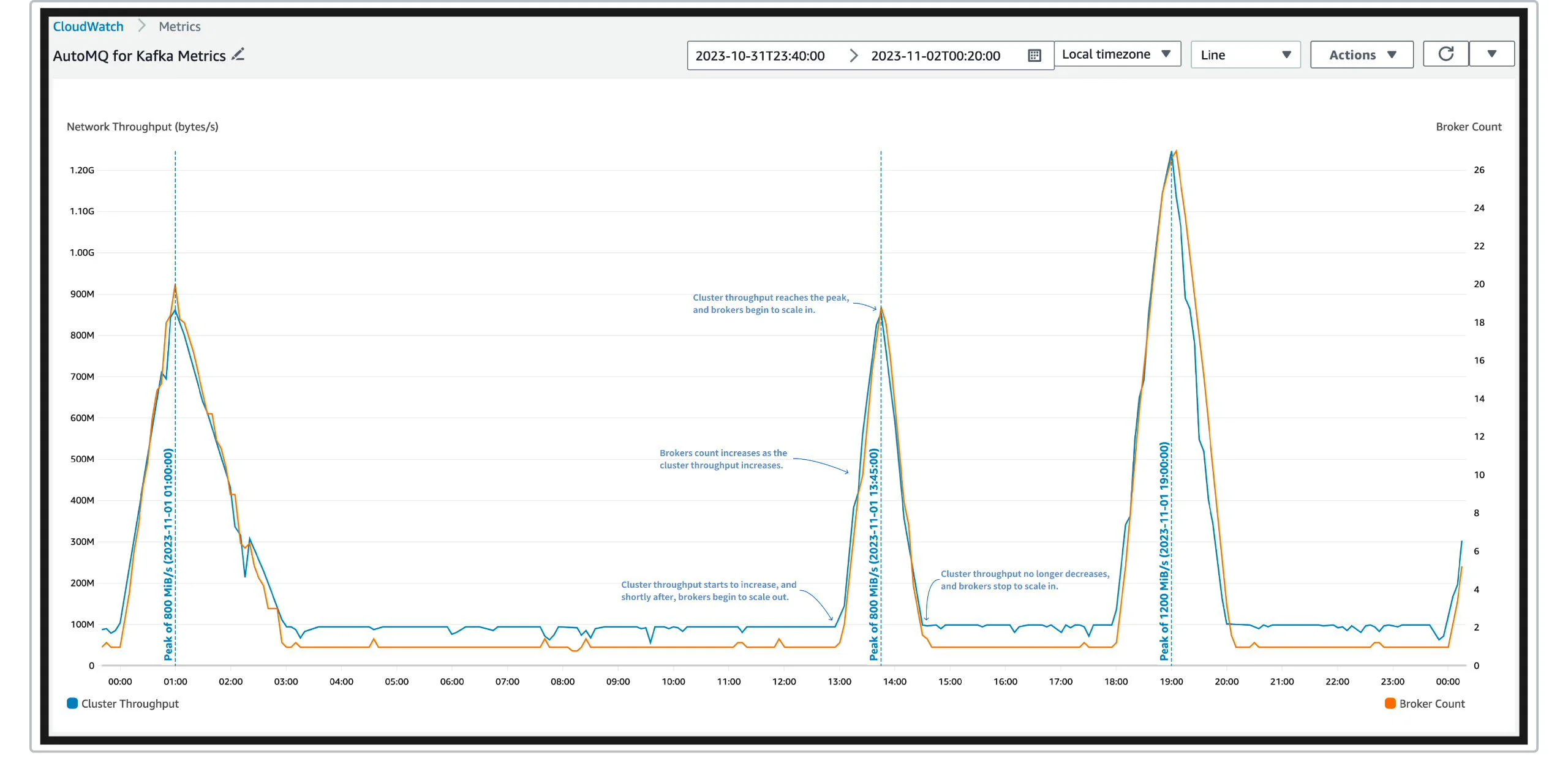 Through AWS CloudWatch, we can get the relationship between the number of brokers and the total cluster traffic over time. As shown in the following figure: