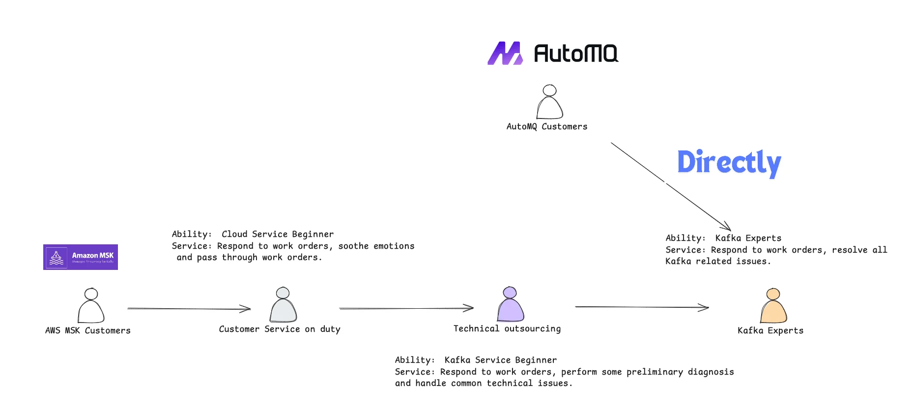 - AutoMQ Business Edition provides free direct support from technical experts : Most major cloud providers do not offer direct interaction with their core product development teams to customers as this significantly increases their costs. If you use AWS MSK, your support requests will pass through multiple handlers before reaching the core development team. AutoMQ Business Edition offers more user-friendly commercial support, allowing direct consultation, troubleshooting, and diagnosis with the core development team, and rapid intervention in emergencies. Shorter and more professional support means your queries will receive better quality responses, reducing the time your staff spends on problem-solving and significantly lowering the overall TCO. Notably, this commercial technical support from AutoMQ is included in your business subscription at no extra cost.