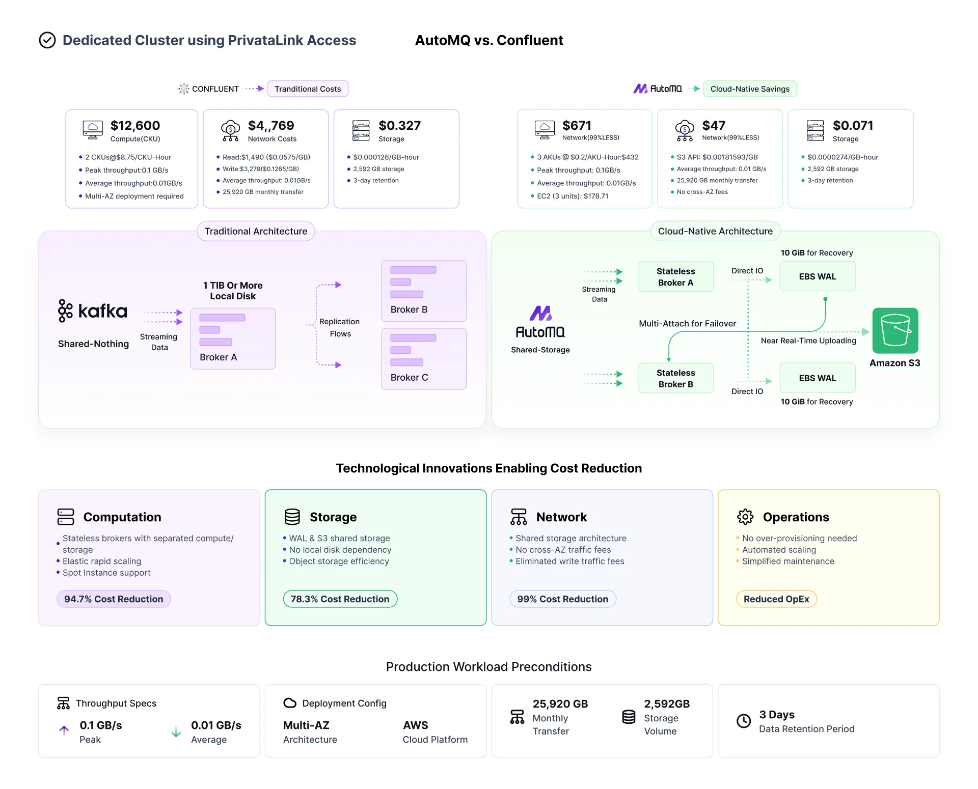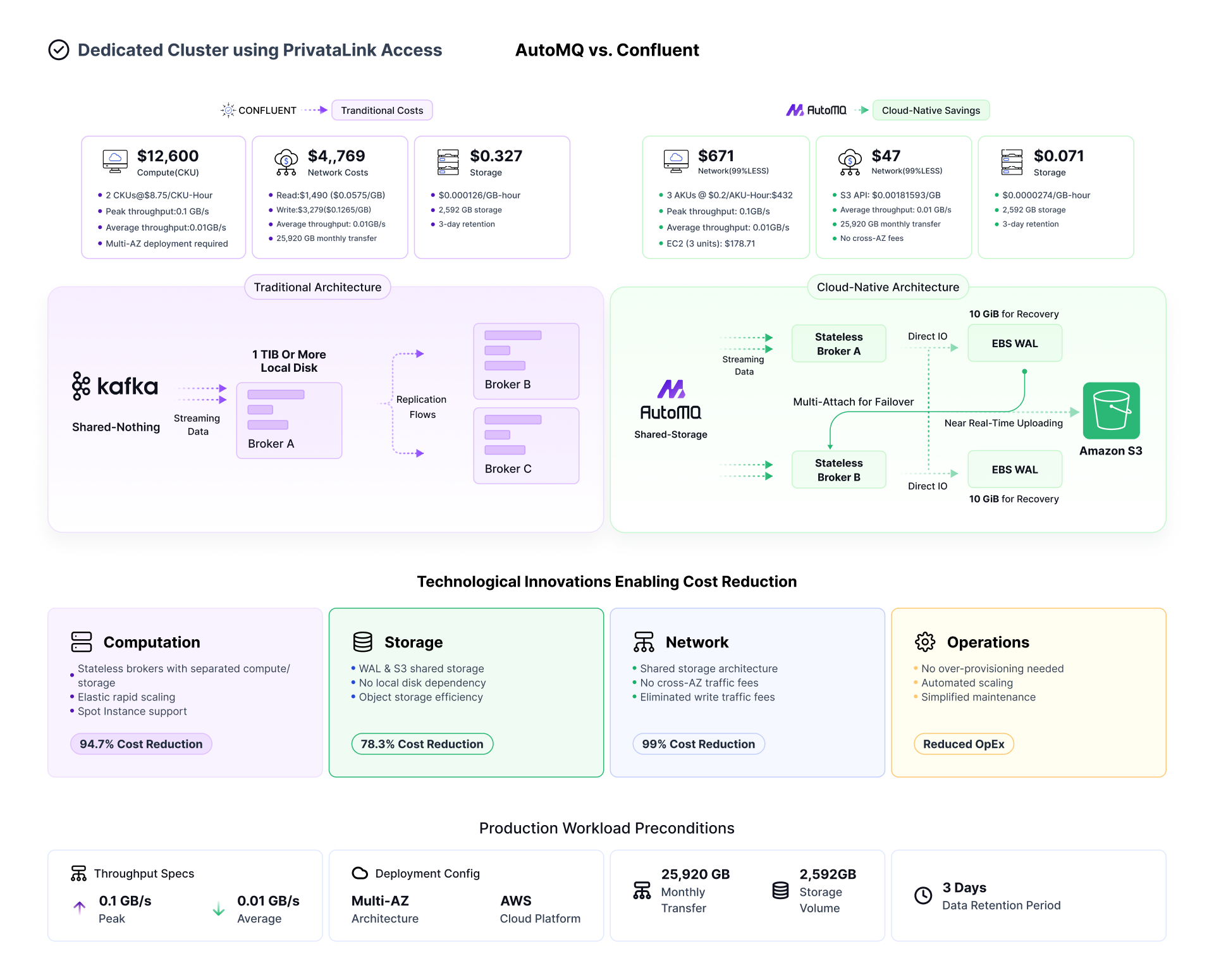 The following diagram illustrates how AutoMQ leverages technical innovations to reduce costs by over 90% compared to Confluent, without any performance degradation, under typical production workloads. These technical innovations primarily include: