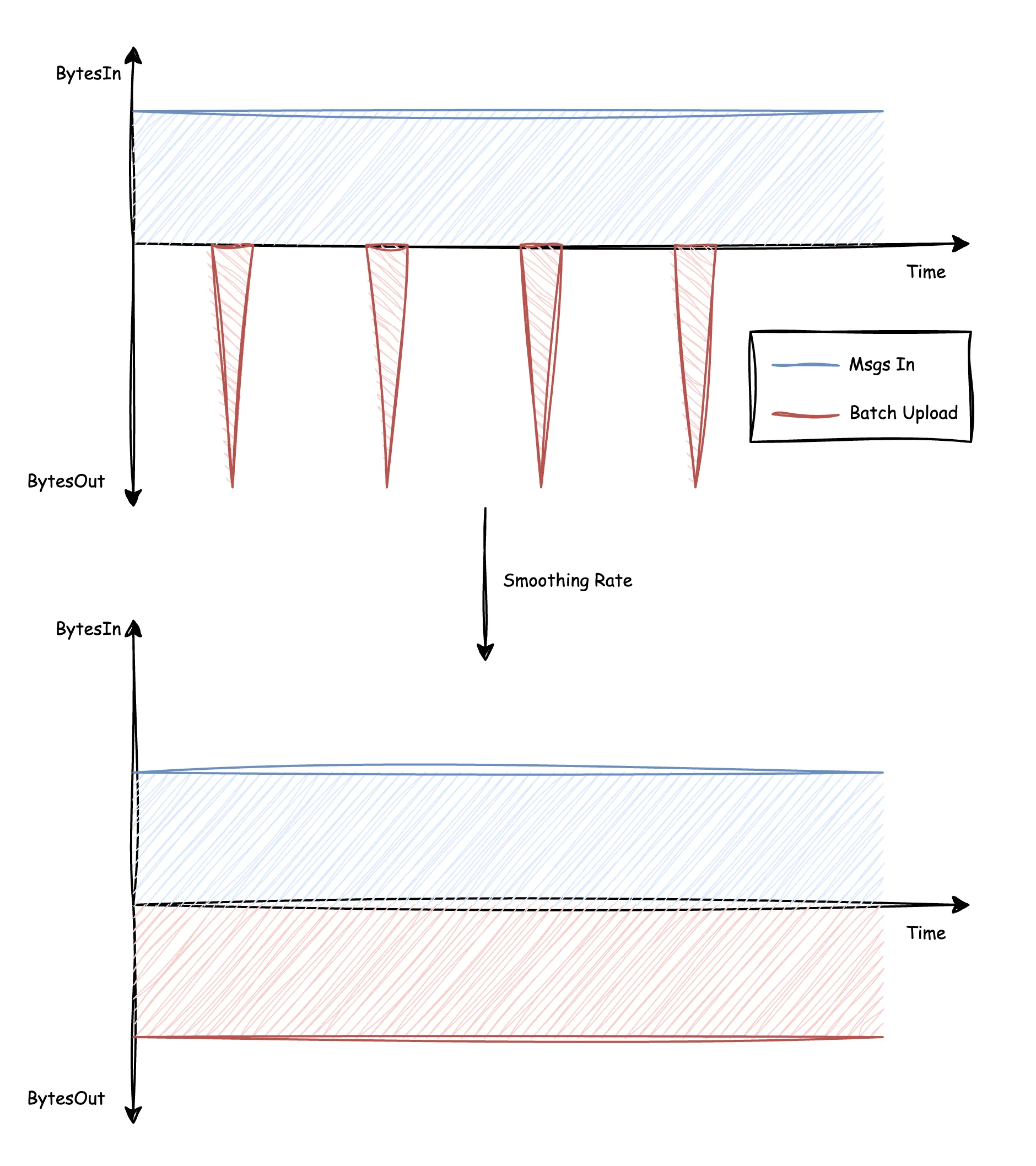 When messages are batched in memory and ready, they are triggered to upload to S3. Given that the default batch size is generally several hundred MB, each upload results in writing several hundred MB of data into the network at one time, causing significant network spikes. Under limited machine bandwidth conditions, this could lead to latency spikes in the regular message processing workflow, affecting business stability. Ideally, the upload rate should match the send rate to achieve smooth upload traffic.
