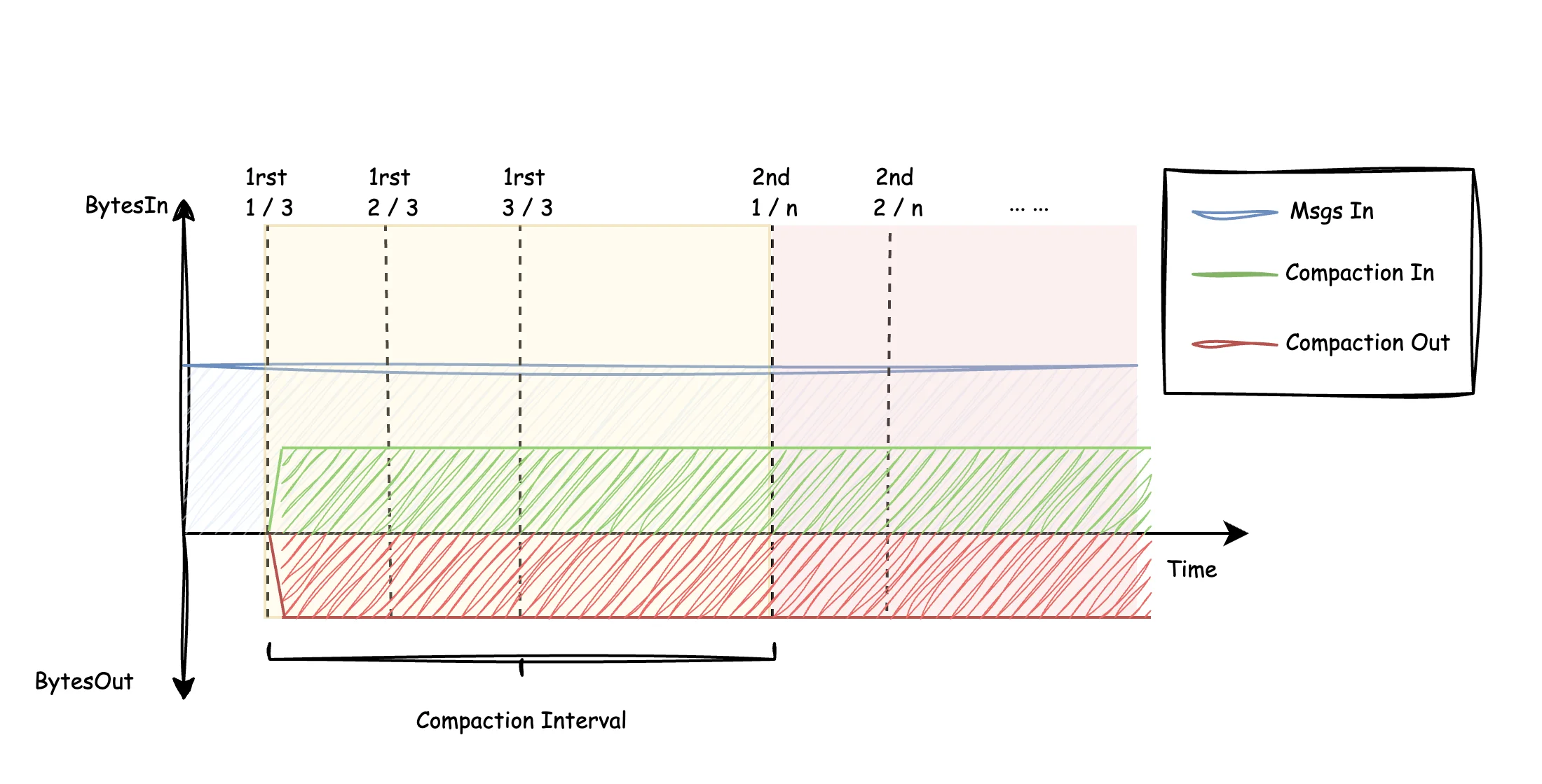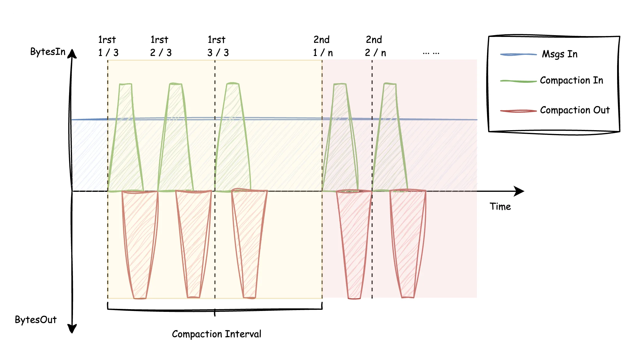 At the beginning of each iteration of every Compaction round, a centralized trigger initiates a read operation to load the data that needs to be compacted to the local storage. After the data is merged locally, it is uploaded as a new S3 Object. By applying smooth rate limiting to Compaction, the read and upload traffic of Compaction is distributed over the entire Compaction cycle. This results in stable "background traffic" within the system, thereby minimizing any spiky impact on the system: