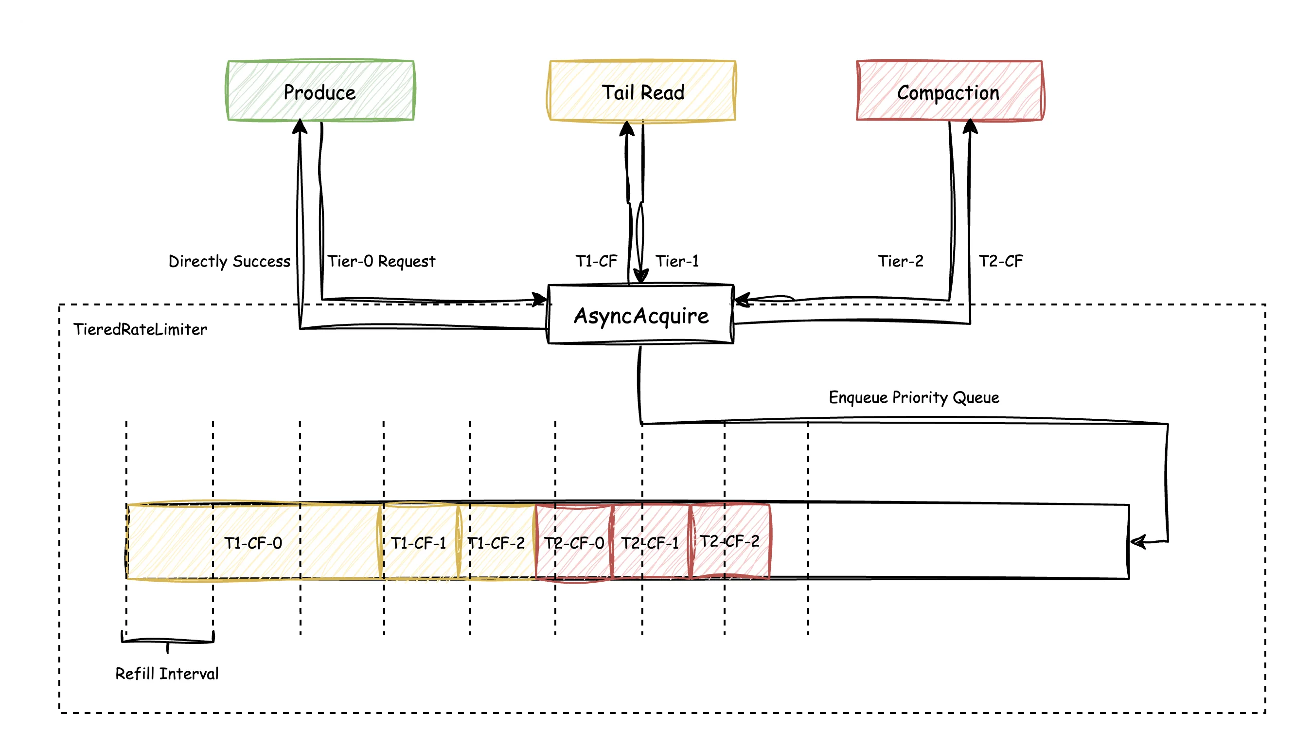 For Tier-0 requests, the rate limiter does not apply any traffic control. Once the corresponding token for a request is deducted, it immediately returns success. For Tier-1 to Tier-3 requests, if the available tokens are insufficient, the requests are placed into a priority queue based on their priority. When tokens are added to the token bucket periodically, the callback thread is awakened to attempt fulfilling the queued requests from the head of the queue. If the token size of a request exceeds the tokens added per refill, the required token size for the request is deducted from the total token size added and reserved for future completion. When enough tokens are accumulated to satisfy the request, it is completed in one go. For example, in the figure, T1-CF-0 is completed after three refill cycles.