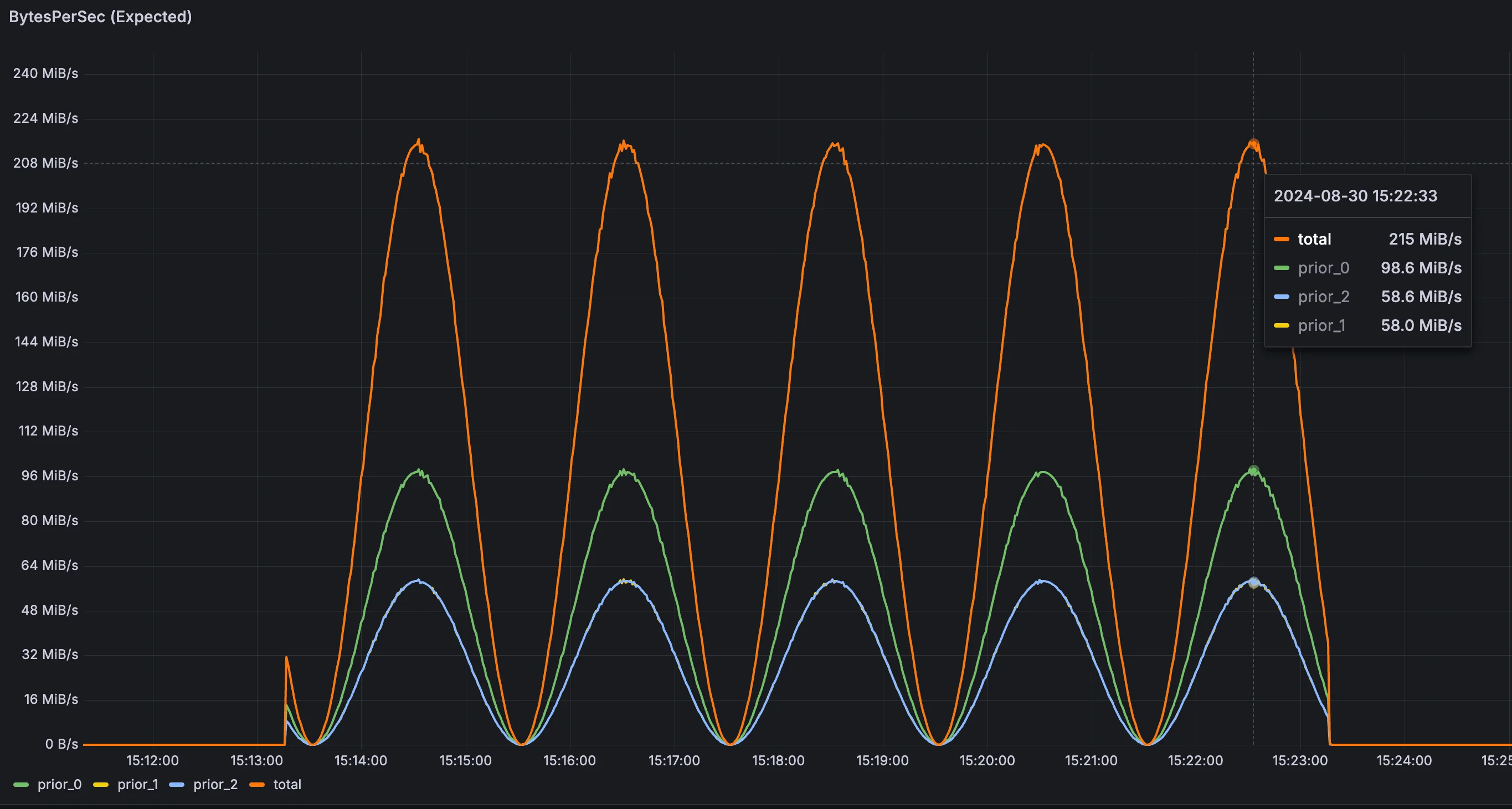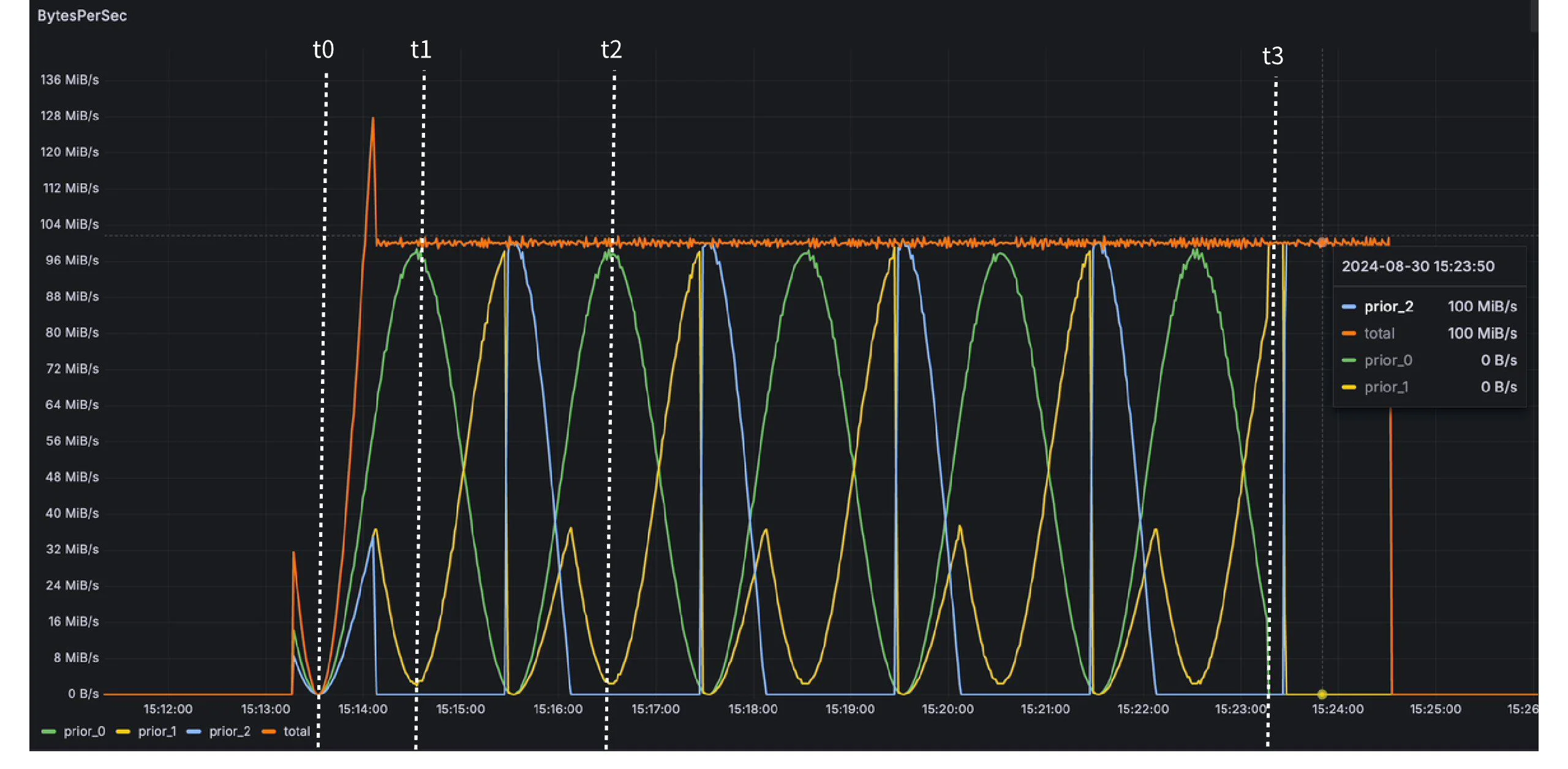 t3 ~ end: As Tier-0 traffic ceases, Tier-1 and Tier-2 queued traffic is sequentially released until the pressure traffic depletes, all while maintaining a maximum traffic limit of 100MB/s throughout.