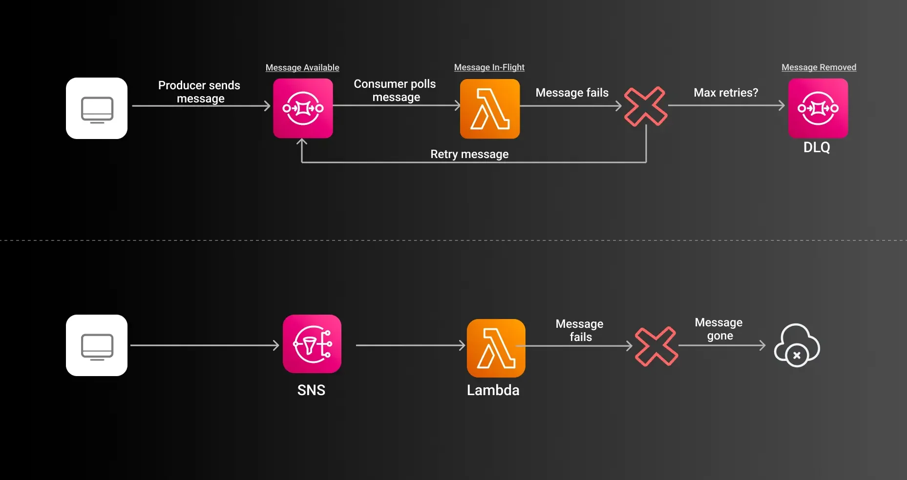 Both SQS and SNS support Dead Letter Queues to handle failed message processing: