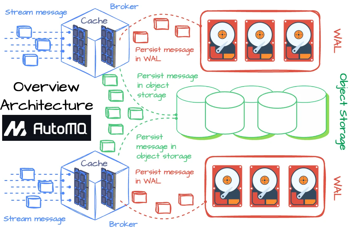 AutoMQ is built on a diskless, shared-storage architecture, meaning brokers are stateless and data lives on cloud object storage like S3. That design instantly solves Kafka's most significant pain points: storage cost, scaling time, and operational overhead.