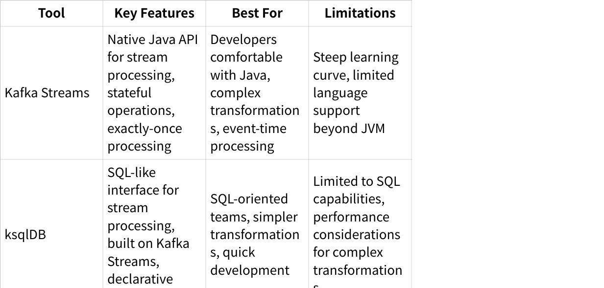 Native Kafka solutions like Kafka Streams and ksqlDB offer deep integration and performance advantages for teams with the technical expertise to utilize them. General-purpose ETL tools with Kafka support provide easier implementation but may have limitations for complex streaming scenarios. Specialized solutions for CDC and other use cases address specific needs but may introduce additional complexity.