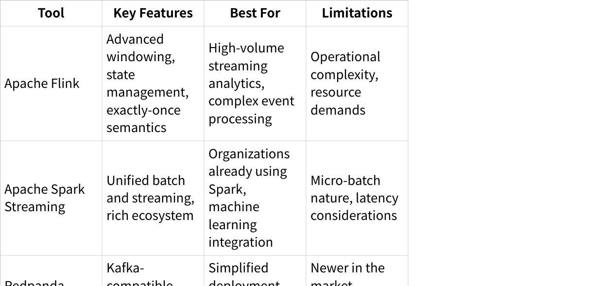 Organizations should evaluate tools based on their throughput requirements, latency expectations, and scaling capabilities. Native solutions like Kafka Streams generally offer better performance integration, while managed services may provide easier scaling with some performance tradeoffs.