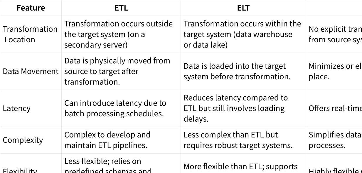 Zero-ETL : An emerging approach that eliminates traditional ETL processes by providing real-time access to data across independent sources without the overhead of data movement and transformation.