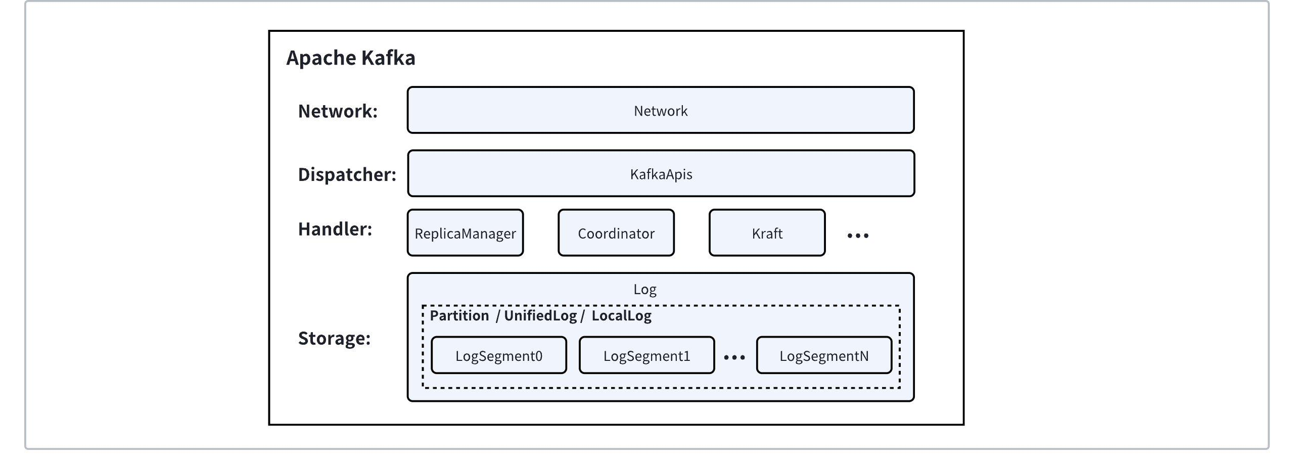 • Business Logic Layer: Split into finer sub-modules to handle different business logic. ReplicaManager is responsible for message sending and receiving and partition management; Coordinator is responsible for consumer management and transactional messages; Kraft is responsible for cluster metadata;