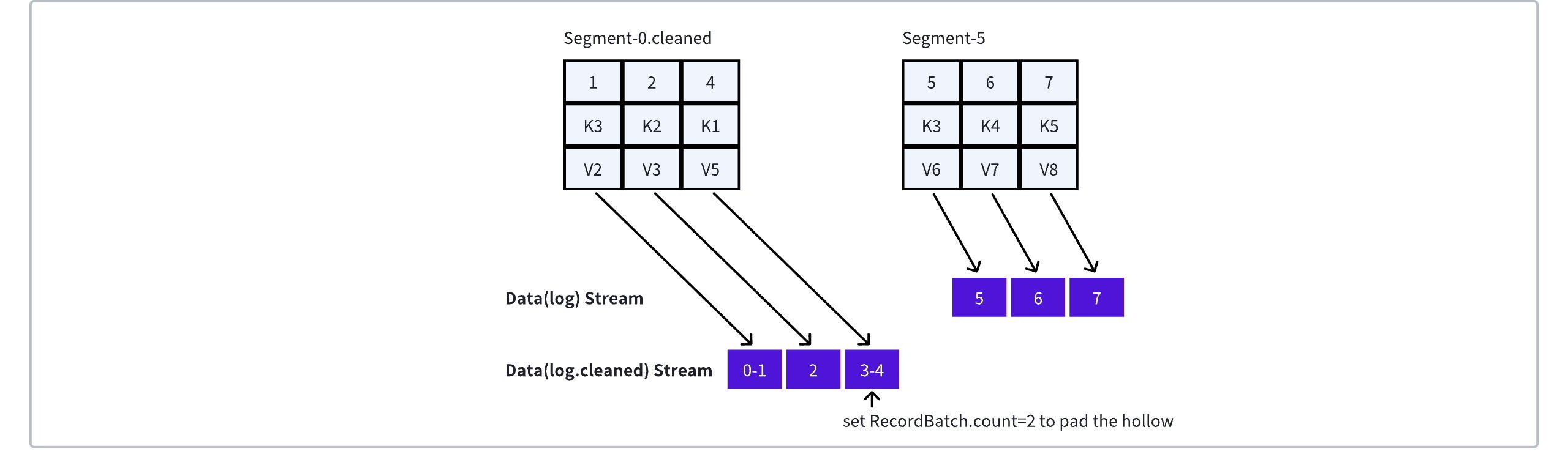 In the previously mentioned Compact Topic scenario, assume Segment-0 and Segment-2 will be compacted into Segment-0.cleaned. The baseOffset of the Segment is 0, mapped to the [0, 5) range in the Data(log.cleaned) Stream. To ensure continuous addressing in the Stream, the message with offset = 1 in Kafka will be mapped to RecordBatch{offset=0, count=2}, where count=2 is used to fill the gap created by the compaction of offset = 0. Similarly, the message with offset = 2 in Kafka is mapped to RecordBatch{offset=2, count=1}, and the message with offset = 4 is mapped to RecordBatch{offset=3, count=2}.
