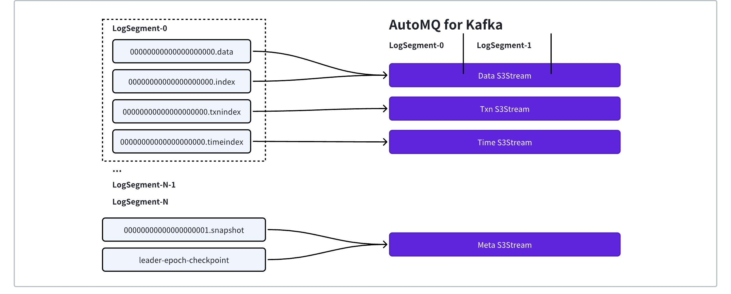 • Data: The S3Stream API already provides the capability to query data based on logical offsets. Thus, xxx.data and xxx.index can be replaced together by Data S3Stream.