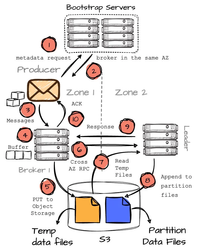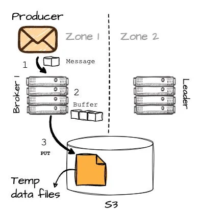 - Here’s where it gets interesting: after successfully writing the messages to S3, B1 makes an RPC request to B2 (the actual leader of the partition) to inform it about the temporary data, including its location (this will result in a small amount of cross-AZ traffic between brokers in different AZs.)