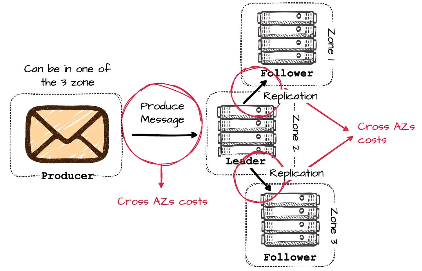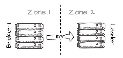 Here are some numbers to make it easier to imagine: consider a Kafka cluster with three brokers distributed across three different availability zones. If one broker in a zone goes down, the cluster can still serve users with the two remaining followers. A well-balanced cluster will try to place partition leaders across three zones, implying that the producers will write to a leader in another zone roughly two-thirds of the time.