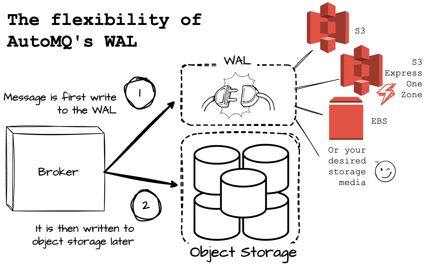 A great feature of AutoMQ's WAL is its flexibility, allowing users to choose different storage options to suit their specific use cases. For instance, if AWS releases a more advanced disk device in the future, users can seamlessly adopt this new storage option to enhance AutoMQ's performance.