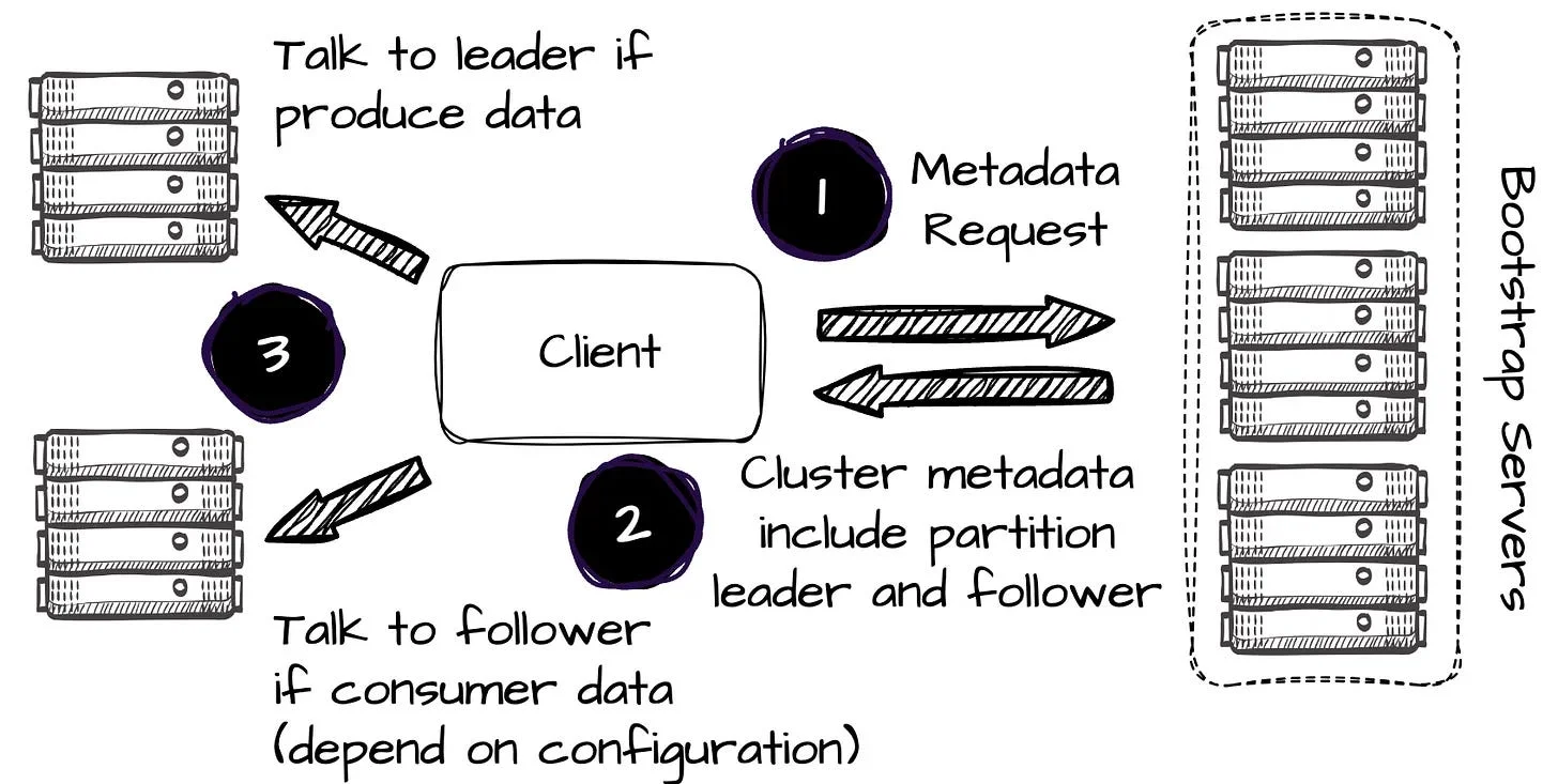 In Kafka, the producers send metadata requests to bootstrap servers to retrieve metadata, including the identity of the partition leader broker, before sending messages. When producing data, the client always attempts to communicate with the leader of a given topic partition.