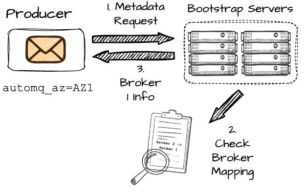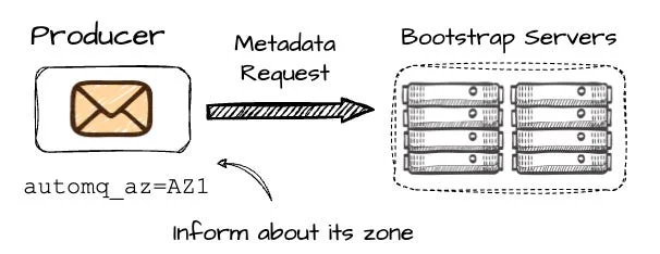 - When the producer wants to write to the P2, it first makes the metadata request to the set of bootstrap brokers; the producer must include information about its AZ, which in this case is AZ1.