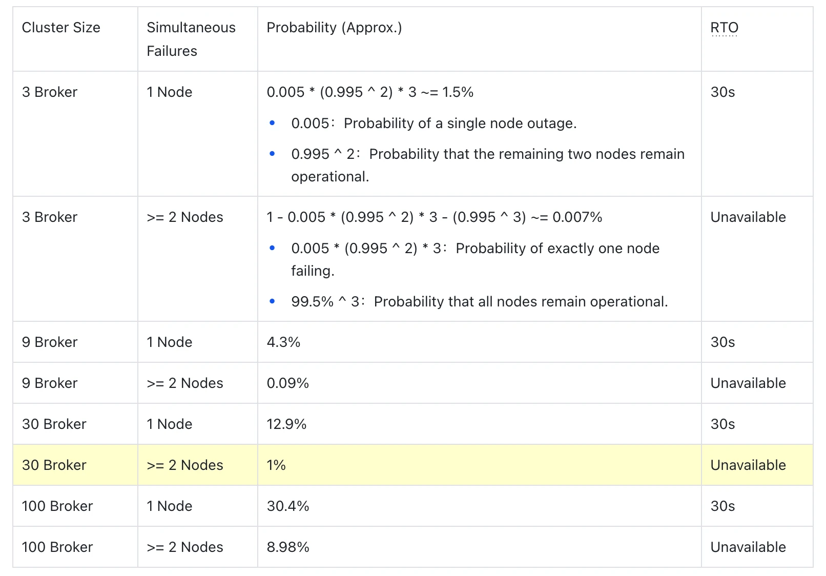 However, in distributed system design, we must account for more severe scenarios. As business growth drives cluster expansion, the laws of probability will inevitably push the limits of system availability. To quantify this risk, we have built a probability model based on real-world SLA data, focusing on how RTO fluctuates when driven by broker failures.