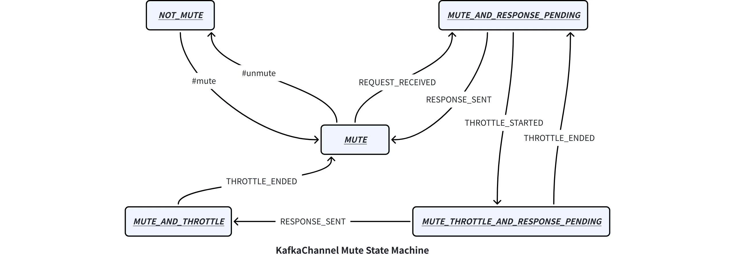 Receiving Requests: When a Processor parses a complete request from the network, it first adds the request to the RequestChannel, then calls the #mute method to change the KafkaChannel's state from NOT_MUTE to MUTE, and sends a REQUEST_RECEIVED event to transition to MUTE_AND_RESPONSE_PENDING state. Note: Until a corresponding response is received for this request, the Processor will not attempt to read more requests from connections that are not in the NOT_MUTE state (Processor#processCompletedReceives).