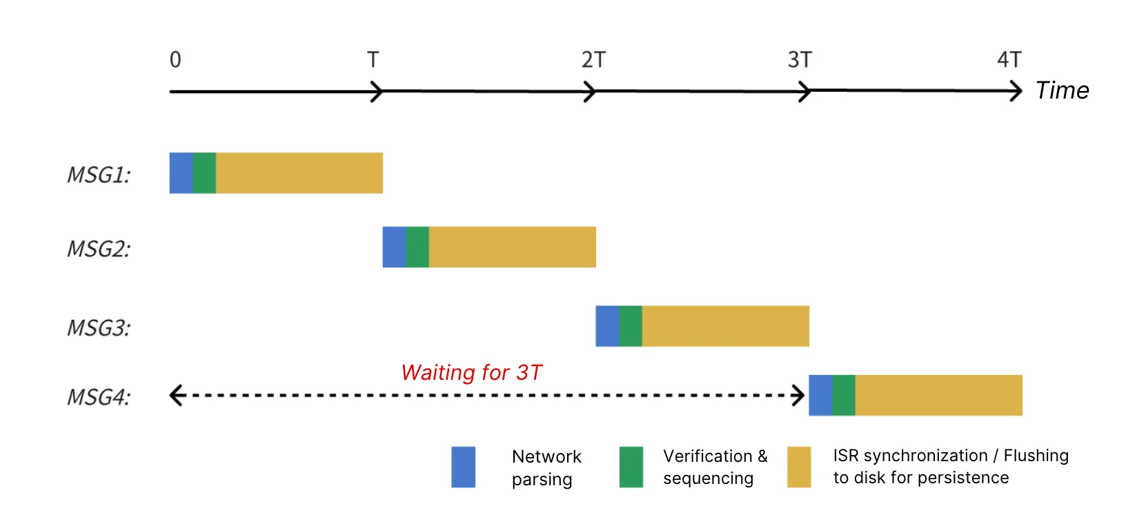 As illustrated below, even if the client sets max.in.flight.requests.per.connection = 5, MSG1 to MSG4 "arrive" at the server "simultaneously", MSG4 must wait until the previous three requests have been processed and responded before it can begin processing, resulting in a total send time for MSG4 of 4T.