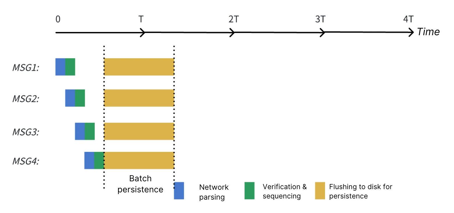 Pipeline processing at different stages allows the network thread to parse MSG1 and then immediately proceed to parse MSG2 without waiting for the persistence of MSG1 to complete. Similarly, once the RequestHandler has completed the verification and ordering of MSG1, it can immediately start processing MSG2;
