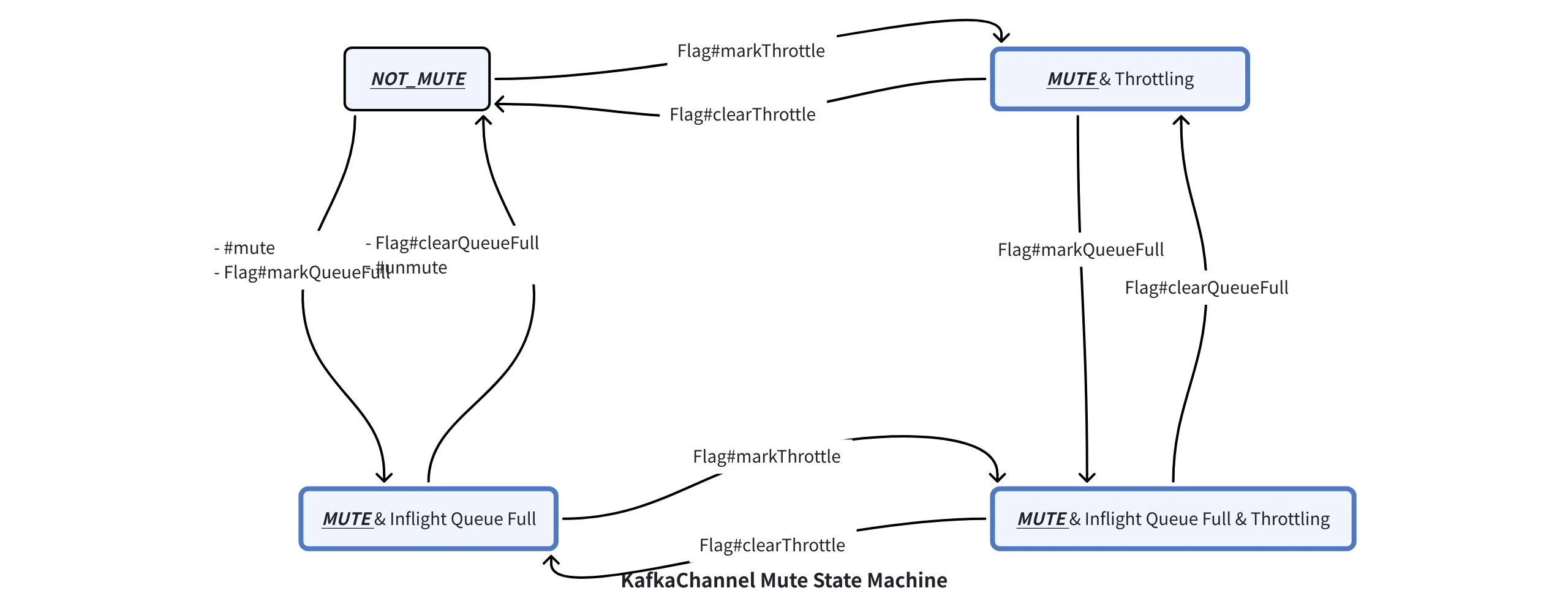 First, the state machine of KafkaChannel's mute state has been simplified, retaining only two states: MUTE and NOT_MUTE. Unlike before, it no longer mutes the corresponding connections upon receiving requests, nor does it serially process requests throughout the entire chain. This approach fully leverages the capabilities of the network parsing layer, continuously parsing new requests from connections. Additionally, to support Quota capabilities and prevent excessive Inflight requests from causing memory OOM, a Flag has been added to indicate the reasons for the current MUTE state. A connection will revert to a NOT_MUTE readable state only when the Flag is cleared.