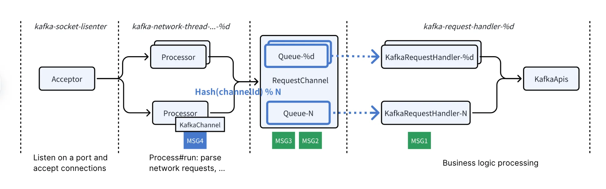 RequestChannel: After the Processor parses requests from the network, it places them into the single-queue RequestChannel, from where the KafkaRequestHandler pulls them for concurrent multi-threaded processing;