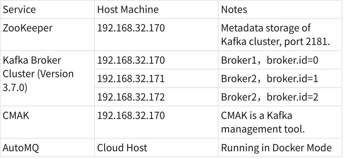 This article focuses on monitoring Kafka and AutoMQ clusters. For host monitoring and JVM monitoring, you are likely already familiar with. To better explain, we will first briefly introduce the verification environment involved, which includes dependency components like ZooKeeper, the Kafka/AutoMQ clusters themselves, and the CMAK monitoring service.