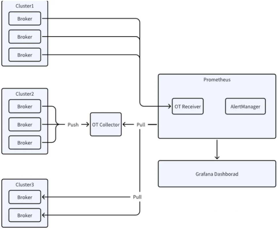 I must admit, I ran into several issues here, but it turned out to be fairly straightforward. The key is to add the metrics configuration to the Broker and Controller configuration files before starting them, so that the Broker and Controller can push monitoring data to the OTel Collector. Note that otlp.endpoint should be changed to the IP address of your actual environment, as Docker containers can directly access the host network. Here, the IP address of the host is used.