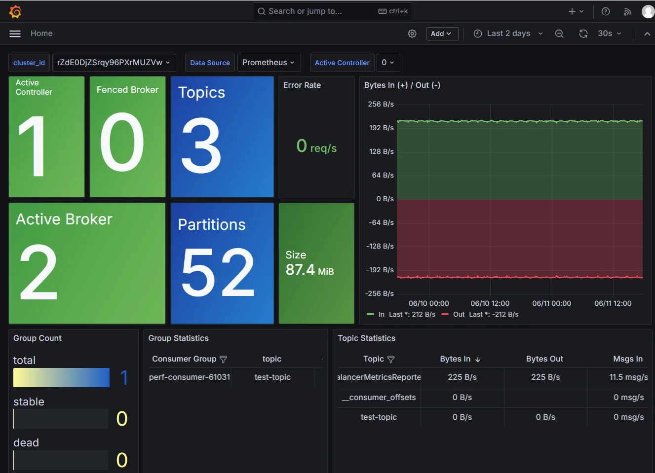 ...broker1Finally, access Grafana through your browser to see AutoMQ monitoring data, including the number of Controllers, Brokers, Partitions, bytes sent/received per second, topics, consumer groups, and more.